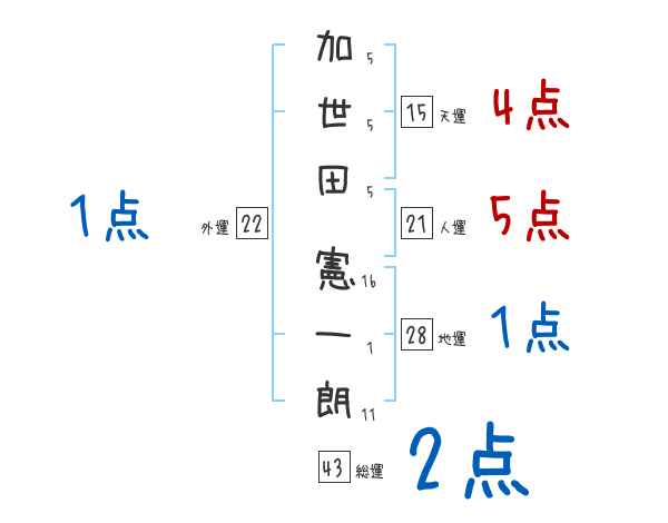 天運![]() | 加世田憲一朗さんの天運は15画の4つ星!人徳があり出世する。順調に物事を進め円満な人生。 家系が持つ宿命的な運勢を表します。祖先から受け継いだ苗字ですので自分の力が及びません。家柄を象徴します。 |