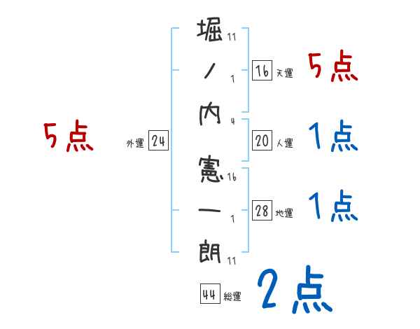 外運![]() | 堀ノ内憲一朗さんの外運は24画の5つ星!家庭運が良く順調な人生。金運にも恵まれる。 生活面を象徴する運勢です。外部から受ける影響力を表し、結婚運、家庭運や職場、環境への順応性を表します。 |
