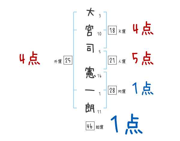 天運![]() | 大宮司憲一朗さんの天運は18画の4つ星!情熱的で剛気。忍耐力があり信頼される。 家系が持つ宿命的な運勢を表します。祖先から受け継いだ苗字ですので自分の力が及びません。家柄を象徴します。 |