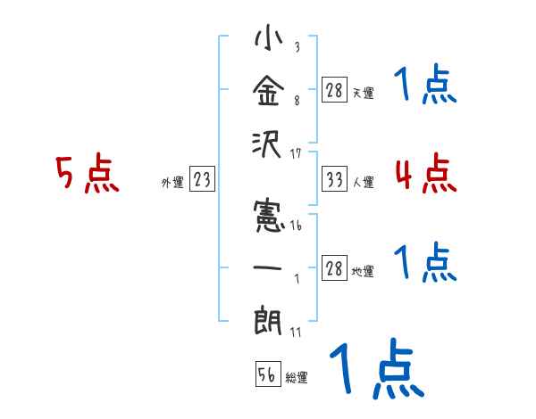 外運![]() | 小金沢憲一朗さんの外運は23画の5つ星!想像力に優れ活力がある。一代で成功し名誉を手に入れる。 生活面を象徴する運勢です。外部から受ける影響力を表し、結婚運、家庭運や職場、環境への順応性を表します。 |
