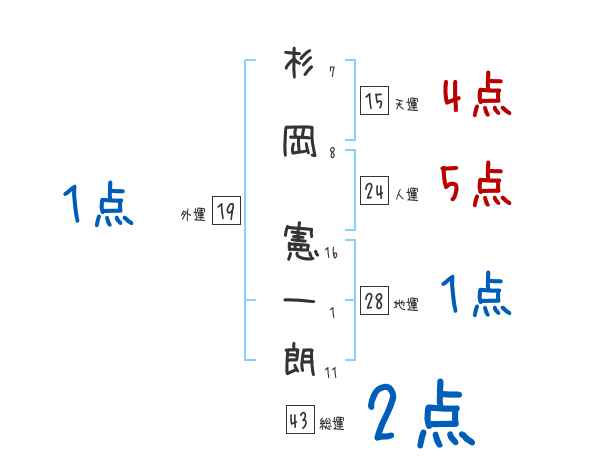 外運![]() | 杉岡憲一朗さんの外運は19画の1つ星!優れた才能を持ちますが、協調性が足りないことも。周りの人と協力する事を意識しましょう。 生活面を象徴する運勢です。外部から受ける影響力を表し、結婚運、家庭運や職場、環境への順応性を表します。 |