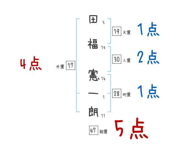 外運![]() | 田福憲一朗さんの外運は17画の4つ星!積極的な行動力。地位を気づき財産を手に入れる。純粋な心と直感力。 生活面を象徴する運勢です。外部から受ける影響力を表し、結婚運、家庭運や職場、環境への順応性を表します。 |
