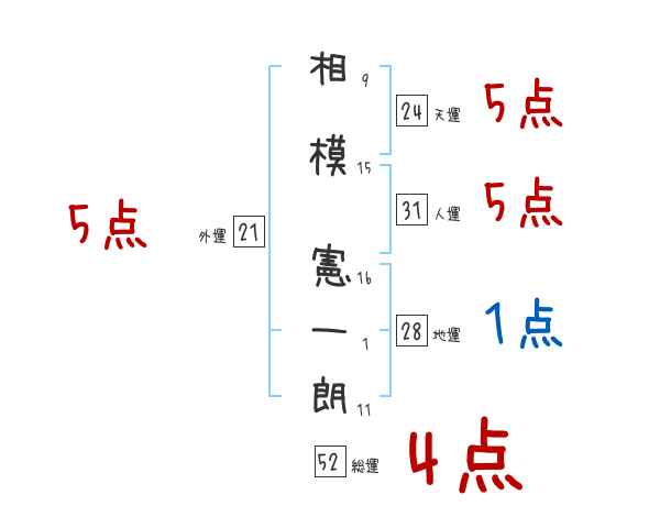 天運![]() | 相模憲一朗さんの天運は24画の5つ星!家庭運が良く順調な人生。金運にも恵まれる。 家系が持つ宿命的な運勢を表します。祖先から受け継いだ苗字ですので自分の力が及びません。家柄を象徴します。 |