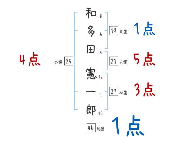 人運![]() | 和多田憲一郎さんの人運は21画の5つ星!統率力がある。独立し成功する。名誉を手に入れる。 性格や才能などを表す2番目に重要な運勢です。人間関係や協調性、社会的な成功に影響します。主に20歳から50歳ぐらいまでの中年期の運勢を表します。 |