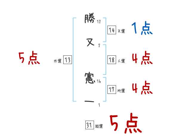 外運![]() | 勝又憲一さんの外運は13画の5つ星!才能に恵まれ人気がある。名声を手に入れる。円満な人生。 生活面を象徴する運勢です。外部から受ける影響力を表し、結婚運、家庭運や職場、環境への順応性を表します。 |