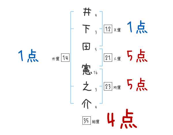 天運![]() | 井下田憲之介さんの天運は12画の1つ星!簡単な失敗で諦めてしまいやすいかも。着実に行動すると良いでしょう。 家系が持つ宿命的な運勢を表します。祖先から受け継いだ苗字ですので自分の力が及びません。家柄を象徴します。 |