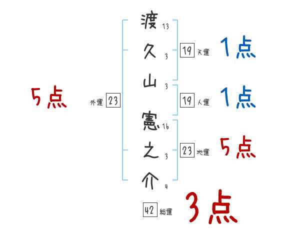 外運![]() | 渡久山憲之介さんの外運は23画の5つ星!想像力に優れ活力がある。一代で成功し名誉を手に入れる。 生活面を象徴する運勢です。外部から受ける影響力を表し、結婚運、家庭運や職場、環境への順応性を表します。 |