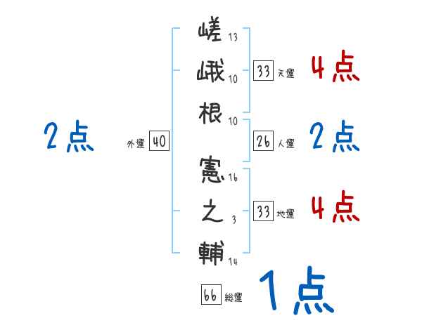 嵯峨根憲之輔さんの画数の鑑定結果