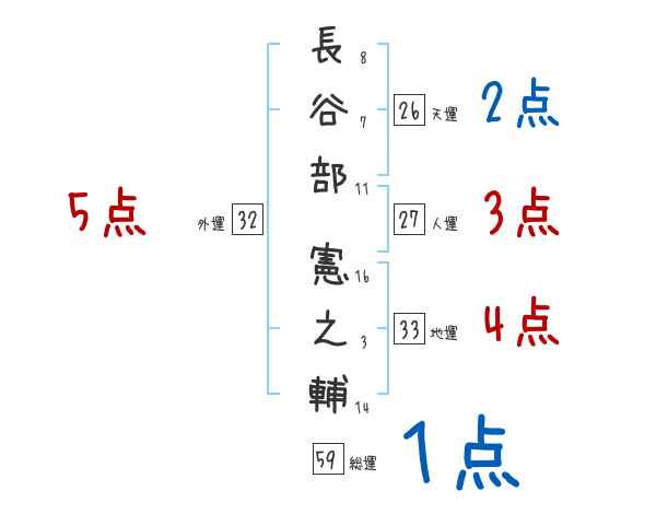 外運![]() | 長谷部憲之輔さんの外運は32画の5つ星!柔軟性があり成功する。チャンスが多く金運が良い。 生活面を象徴する運勢です。外部から受ける影響力を表し、結婚運、家庭運や職場、環境への順応性を表します。 |