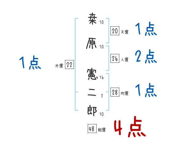 外運![]() | 桒原憲二郎さんの外運は22画の1つ星!努力することが苦手ないっぽう手先が器用。芸術性にも優れる。 生活面を象徴する運勢です。外部から受ける影響力を表し、結婚運、家庭運や職場、環境への順応性を表します。 |