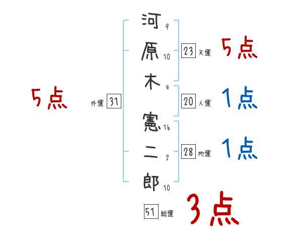 天運![]() | 河原木憲二郎さんの天運は23画の5つ星!想像力に優れ活力がある。一代で成功し名誉を手に入れる。 家系が持つ宿命的な運勢を表します。祖先から受け継いだ苗字ですので自分の力が及びません。家柄を象徴します。 |