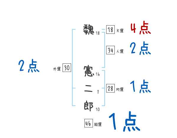 天運![]() | 魏憲二郎さんの天運は18画の4つ星!情熱的で剛気。忍耐力があり信頼される。 家系が持つ宿命的な運勢を表します。祖先から受け継いだ苗字ですので自分の力が及びません。家柄を象徴します。 |