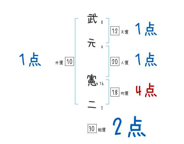 外運![]() | 武元憲二さんの外運は10画の1つ星!不安を感じやすい傾向。ストレスを抱えないように注意しましょう。 生活面を象徴する運勢です。外部から受ける影響力を表し、結婚運、家庭運や職場、環境への順応性を表します。 |