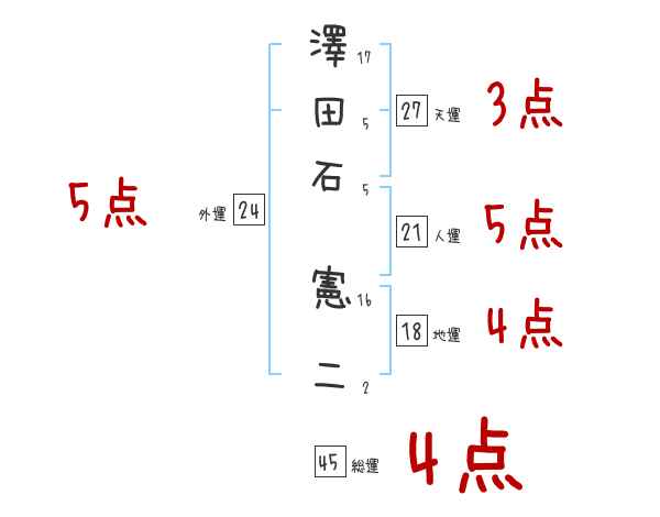 天運![]() | 澤田石憲二さんの天運は27画の3つ星!頭脳明晰だが強情で摩擦が多い傾向。孤立に注意。 家系が持つ宿命的な運勢を表します。祖先から受け継いだ苗字ですので自分の力が及びません。家柄を象徴します。 |