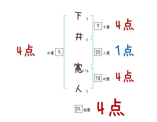 天運![]() | 下井憲人さんの天運は7画の4つ星!強い意志や信念を持ち独立心が強い。自立する。 家系が持つ宿命的な運勢を表します。祖先から受け継いだ苗字ですので自分の力が及びません。家柄を象徴します。 |