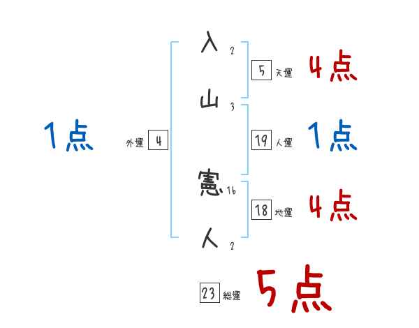 天運![]() | 入山憲人さんの天運は5画の4つ星!健康で安泰。協調性に優れ、財産に恵まれる。 家系が持つ宿命的な運勢を表します。祖先から受け継いだ苗字ですので自分の力が及びません。家柄を象徴します。 |