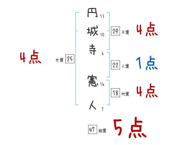 総運![]() | 円城寺憲人さんの総運は47画の5つ星!実力が開花し発展する円満な人生。財に恵まれる。 あなたの人生を表す1番重要な運勢です。生涯を通じて影響する総合運となり、主に50歳以降の晩年期に影響を及ぼします。 |