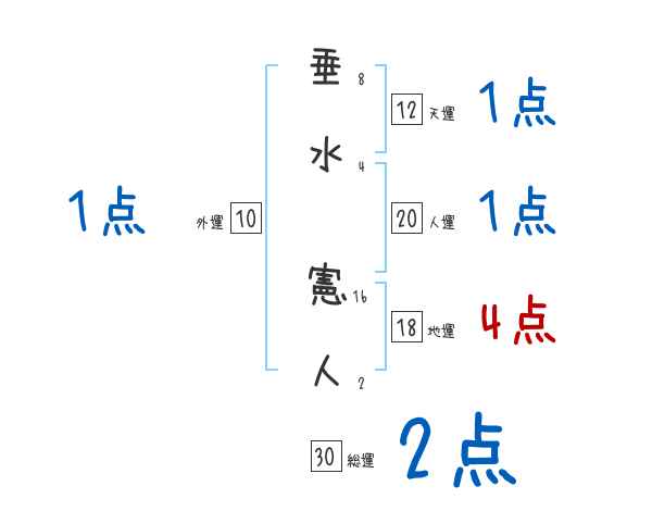 総運![]() | 垂水憲人さんの総運は30画の2つ星!浮き沈みの激しさに注意しましょう。 あなたの人生を表す1番重要な運勢です。生涯を通じて影響する総合運となり、主に50歳以降の晩年期に影響を及ぼします。 |