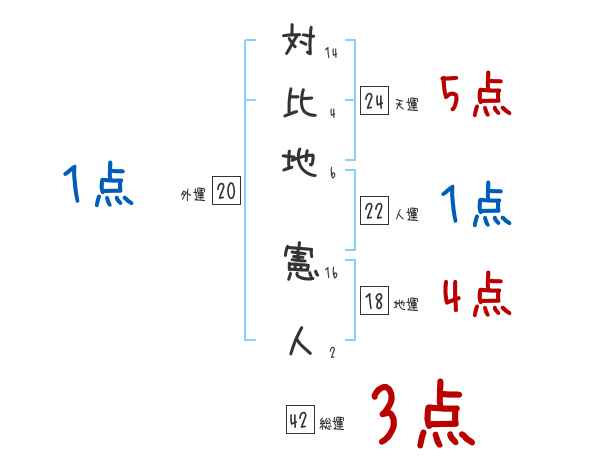 人運![]() | 対比地憲人さんの人運は22画の1つ星!努力することが苦手ないっぽう手先が器用。芸術性にも優れる。 性格や才能などを表す2番目に重要な運勢です。人間関係や協調性、社会的な成功に影響します。主に20歳から50歳ぐらいまでの中年期の運勢を表します。 |