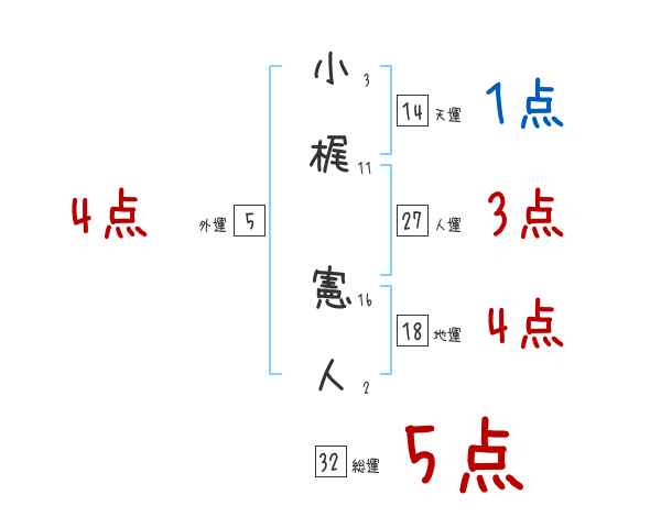 総運![]() | 小梶憲人さんの総運は32画の5つ星!柔軟性があり成功する。チャンスが多く金運が良い。 あなたの人生を表す1番重要な運勢です。生涯を通じて影響する総合運となり、主に50歳以降の晩年期に影響を及ぼします。 |