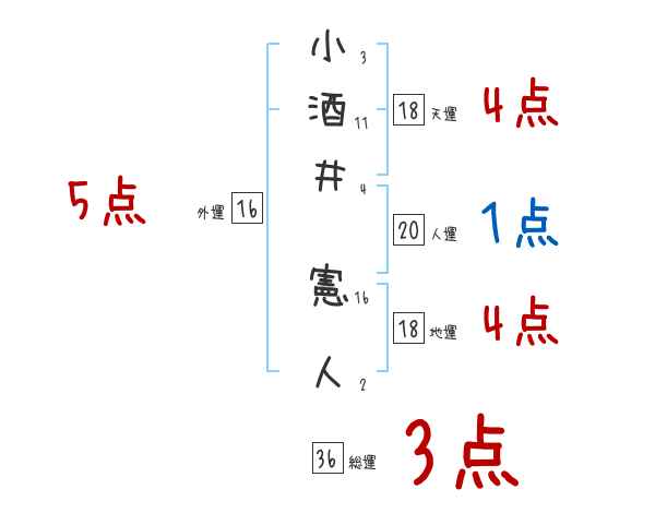 総運![]() | 小酒井憲人さんの総運は36画の3つ星!先見性が豊かです。多少神経質で苦労することも。 あなたの人生を表す1番重要な運勢です。生涯を通じて影響する総合運となり、主に50歳以降の晩年期に影響を及ぼします。 |