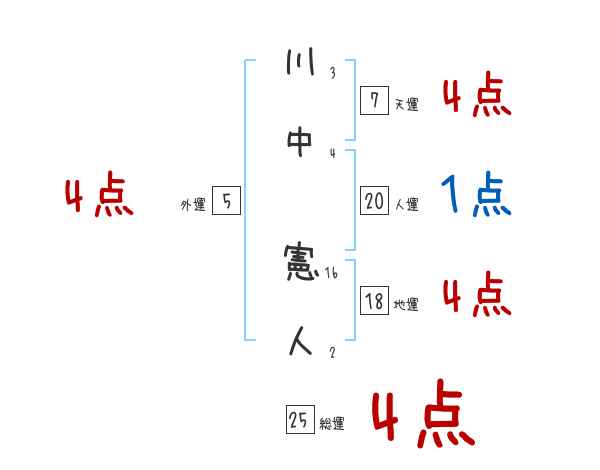 天運![]() | 川中憲人さんの天運は7画の4つ星!強い意志や信念を持ち独立心が強い。自立する。 家系が持つ宿命的な運勢を表します。祖先から受け継いだ苗字ですので自分の力が及びません。家柄を象徴します。 |