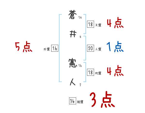 総運![]() | 蒼井憲人さんの総運は36画の3つ星!先見性が豊かです。多少神経質で苦労することも。 あなたの人生を表す1番重要な運勢です。生涯を通じて影響する総合運となり、主に50歳以降の晩年期に影響を及ぼします。 |