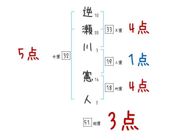外運![]() | 逆瀬川憲人さんの外運は32画の5つ星!柔軟性があり成功する。チャンスが多く金運が良い。 生活面を象徴する運勢です。外部から受ける影響力を表し、結婚運、家庭運や職場、環境への順応性を表します。 |