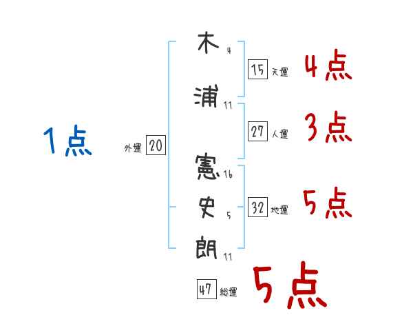 総運![]() | 木浦憲史朗さんの総運は47画の5つ星!実力が開花し発展する円満な人生。財に恵まれる。 あなたの人生を表す1番重要な運勢です。生涯を通じて影響する総合運となり、主に50歳以降の晩年期に影響を及ぼします。 |