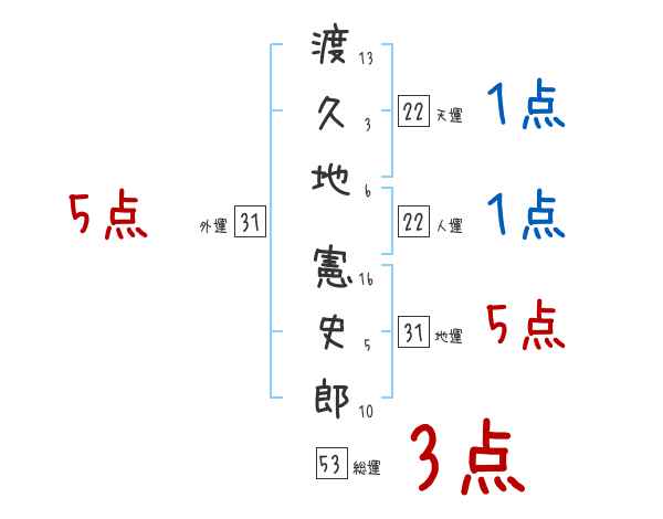 総運![]() | 渡久地憲史郎さんの総運は53画の3つ星!やや見栄っ張りで虚栄心がある。散財に注意。 あなたの人生を表す1番重要な運勢です。生涯を通じて影響する総合運となり、主に50歳以降の晩年期に影響を及ぼします。 |