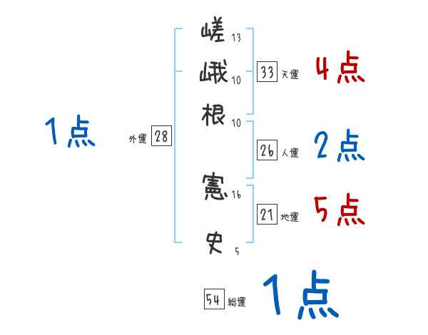 総運![]() | 嵯峨根憲史さんの総運は54画の1つ星!トラブルが多いかも。周りをよく見て協調して過ごしましょう。 あなたの人生を表す1番重要な運勢です。生涯を通じて影響する総合運となり、主に50歳以降の晩年期に影響を及ぼします。 |