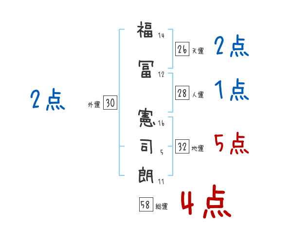 人運![]() | 福冨憲司朗さんの人運は28画の1つ星!家庭環境に注意。スポーツで活躍できる能力があるかも。 性格や才能などを表す2番目に重要な運勢です。人間関係や協調性、社会的な成功に影響します。主に20歳から50歳ぐらいまでの中年期の運勢を表します。 |