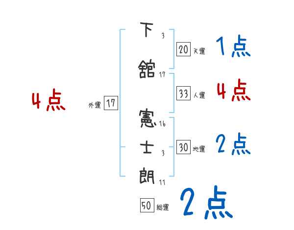 外運![]() | 下舘憲士朗さんの外運は17画の4つ星!積極的な行動力。地位を気づき財産を手に入れる。純粋な心と直感力。 生活面を象徴する運勢です。外部から受ける影響力を表し、結婚運、家庭運や職場、環境への順応性を表します。 |