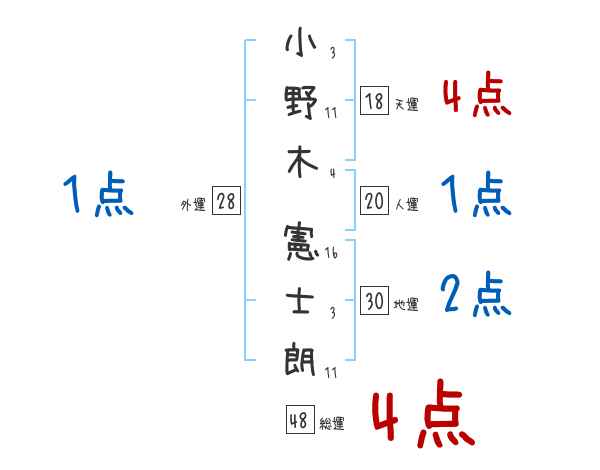 天運![]() | 小野木憲士朗さんの天運は18画の4つ星!情熱的で剛気。忍耐力があり信頼される。 家系が持つ宿命的な運勢を表します。祖先から受け継いだ苗字ですので自分の力が及びません。家柄を象徴します。 |