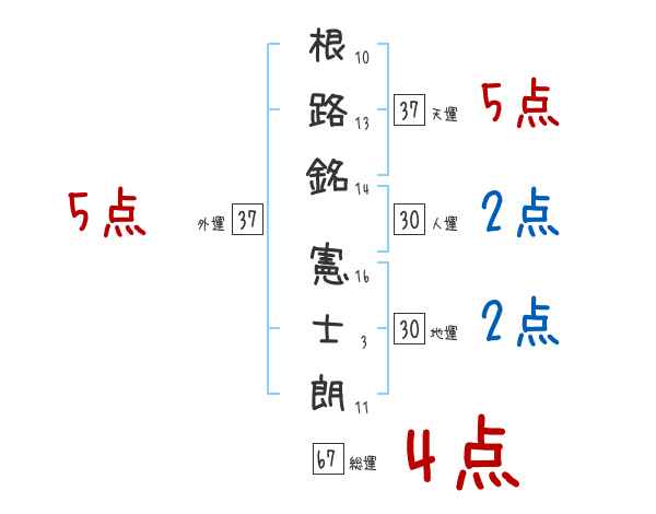 天運![]() | 根路銘憲士朗さんの天運は37画の5つ星!努力家で順応性に優れる。現実的な考え方ができ忠実に物事をこなす。 家系が持つ宿命的な運勢を表します。祖先から受け継いだ苗字ですので自分の力が及びません。家柄を象徴します。 |