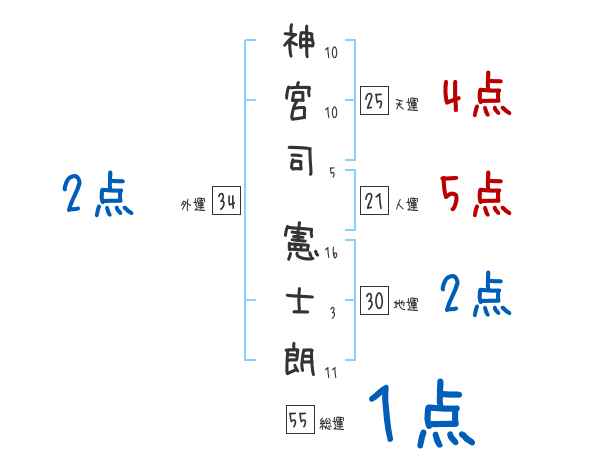 総運![]() | 神宮司憲士朗さんの総運は55画の1つ星!欲張りな性格で軽率な行動に注意しましょう。病気に気をつけて。 あなたの人生を表す1番重要な運勢です。生涯を通じて影響する総合運となり、主に50歳以降の晩年期に影響を及ぼします。 |