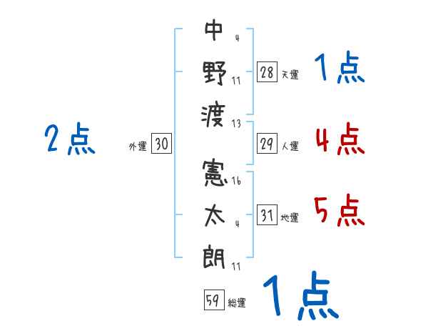 天運![]() | 中野渡憲太朗さんの天運は28画の1つ星!家庭環境に注意。スポーツで活躍できる能力があるかも。 家系が持つ宿命的な運勢を表します。祖先から受け継いだ苗字ですので自分の力が及びません。家柄を象徴します。 |