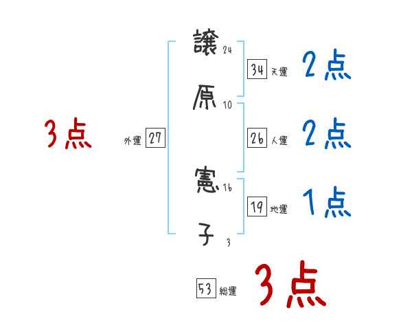総運![]() | 譲原憲子さんの総運は53画の3つ星!やや見栄っ張りで虚栄心がある。散財に注意。 あなたの人生を表す1番重要な運勢です。生涯を通じて影響する総合運となり、主に50歳以降の晩年期に影響を及ぼします。 |