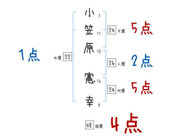 外運![]() | 小笠原憲幸さんの外運は22画の1つ星!努力することが苦手ないっぽう手先が器用。芸術性にも優れる。 生活面を象徴する運勢です。外部から受ける影響力を表し、結婚運、家庭運や職場、環境への順応性を表します。 |
