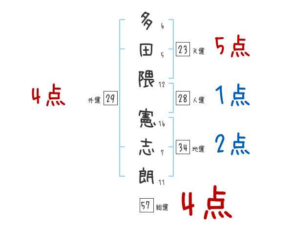 外運![]() | 多田隈憲志朗さんの外運は29画の4つ星!完全主義で才能がある。厳格な心の持ち主。 生活面を象徴する運勢です。外部から受ける影響力を表し、結婚運、家庭運や職場、環境への順応性を表します。 |