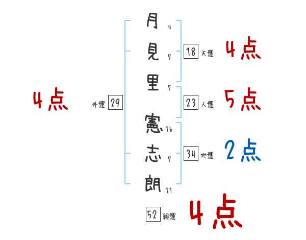 総運![]() | 月見里憲志朗さんの総運は52画の4つ星!先見性と独創性に優れ考える力がある。強運の持ち主。 あなたの人生を表す1番重要な運勢です。生涯を通じて影響する総合運となり、主に50歳以降の晩年期に影響を及ぼします。 |