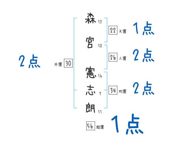 天運![]() | 森宮憲志朗さんの天運は22画の1つ星!努力することが苦手ないっぽう手先が器用。芸術性にも優れる。 家系が持つ宿命的な運勢を表します。祖先から受け継いだ苗字ですので自分の力が及びません。家柄を象徴します。 |