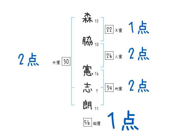 天運![]() | 森脇憲志朗さんの天運は22画の1つ星!努力することが苦手ないっぽう手先が器用。芸術性にも優れる。 家系が持つ宿命的な運勢を表します。祖先から受け継いだ苗字ですので自分の力が及びません。家柄を象徴します。 |