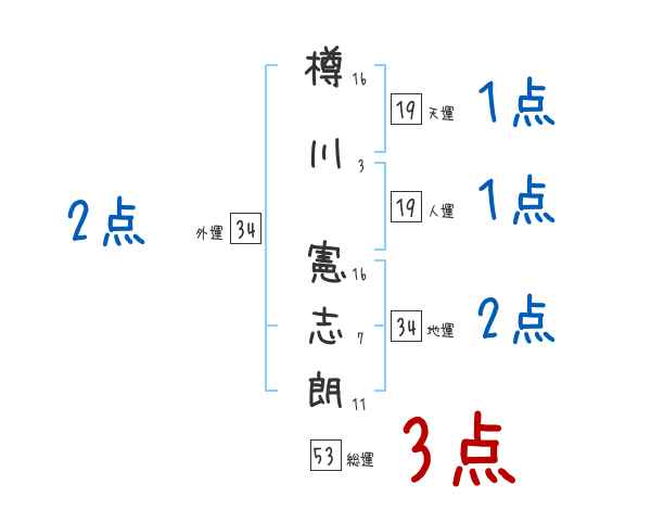 総運![]() | 樽川憲志朗さんの総運は53画の3つ星!やや見栄っ張りで虚栄心がある。散財に注意。 あなたの人生を表す1番重要な運勢です。生涯を通じて影響する総合運となり、主に50歳以降の晩年期に影響を及ぼします。 |