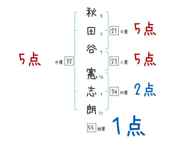 外運![]() | 秋田谷憲志朗さんの外運は32画の5つ星!柔軟性があり成功する。チャンスが多く金運が良い。 生活面を象徴する運勢です。外部から受ける影響力を表し、結婚運、家庭運や職場、環境への順応性を表します。 |