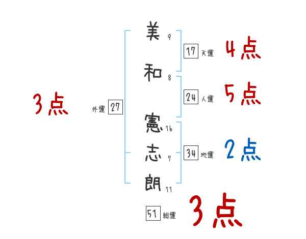 人運![]() | 美和憲志朗さんの人運は24画の5つ星!家庭運が良く順調な人生。金運にも恵まれる。 性格や才能などを表す2番目に重要な運勢です。人間関係や協調性、社会的な成功に影響します。主に20歳から50歳ぐらいまでの中年期の運勢を表します。 |