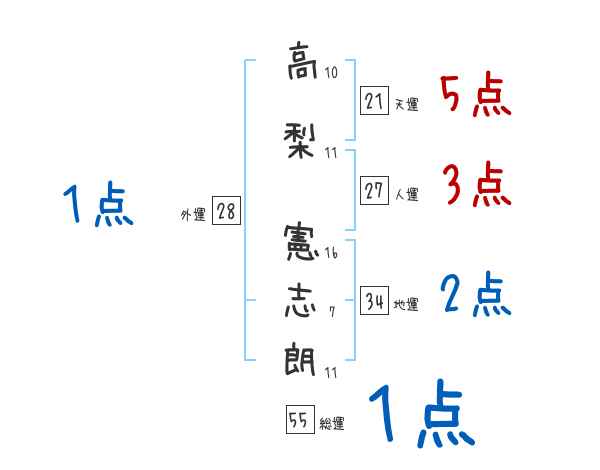 天運![]() | 高梨憲志朗さんの天運は21画の5つ星!統率力がある。独立し成功する。名誉を手に入れる。 家系が持つ宿命的な運勢を表します。祖先から受け継いだ苗字ですので自分の力が及びません。家柄を象徴します。 |