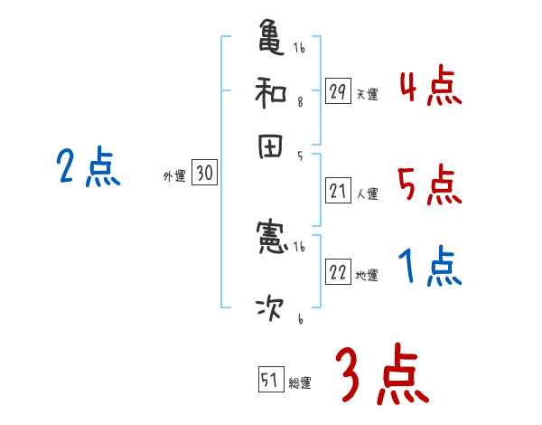 外運![]() | 亀和田憲次さんの外運は30画の2つ星!浮き沈みの激しさに注意しましょう。 生活面を象徴する運勢です。外部から受ける影響力を表し、結婚運、家庭運や職場、環境への順応性を表します。 |