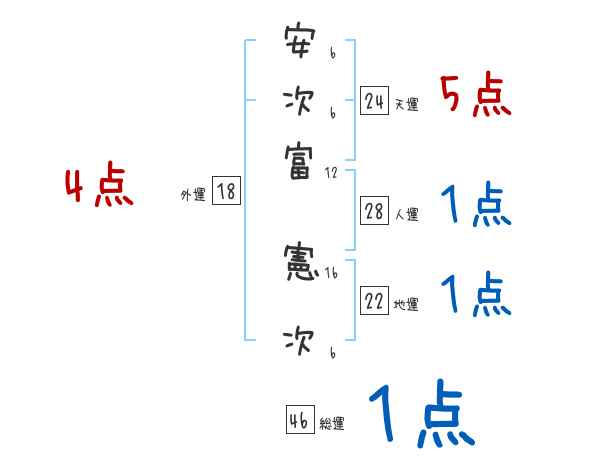 天運![]() | 安次富憲次さんの天運は24画の5つ星!家庭運が良く順調な人生。金運にも恵まれる。 家系が持つ宿命的な運勢を表します。祖先から受け継いだ苗字ですので自分の力が及びません。家柄を象徴します。 |
