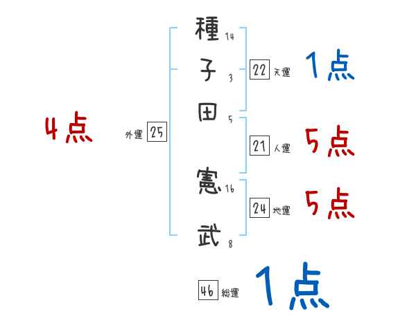 総運![]() | 種子田憲武さんの総運は46画の1つ星!迷走することが多く苦労するかも。目先のことにとらわれないように。 あなたの人生を表す1番重要な運勢です。生涯を通じて影響する総合運となり、主に50歳以降の晩年期に影響を及ぼします。 |
